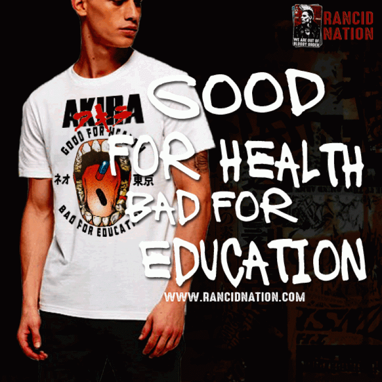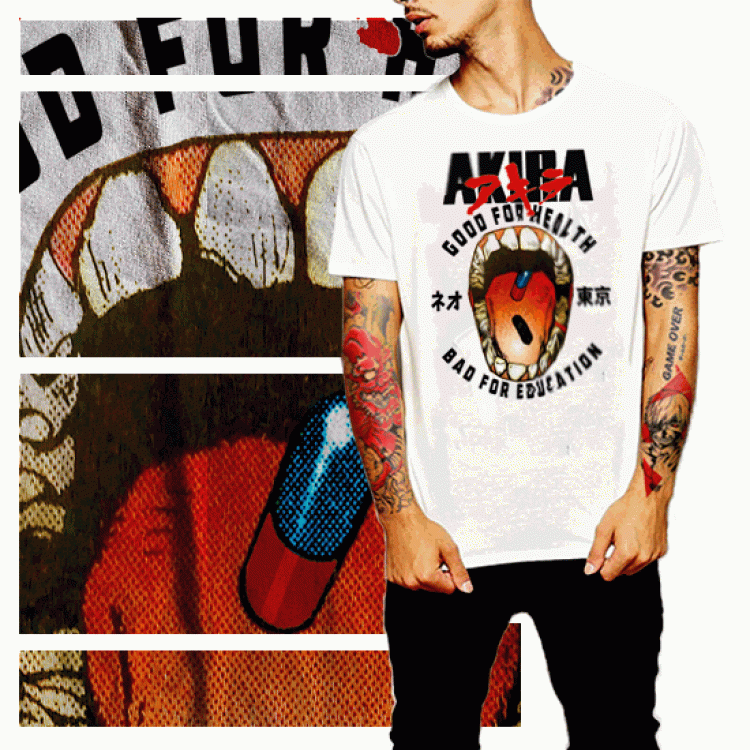 Retro Akira Pill Good For Health Bad for education Cyberpunk Graphic Design. Digitally Printed on soft 100% ring-spun cotton. Premium Soft Style quality Tee. Size XXL is Heavy Cotton. The capsules that Tetsuo take are drugs designed to keep his psychic powers under control. By refusing to take the drugs he mutated into a large fleshy organism.