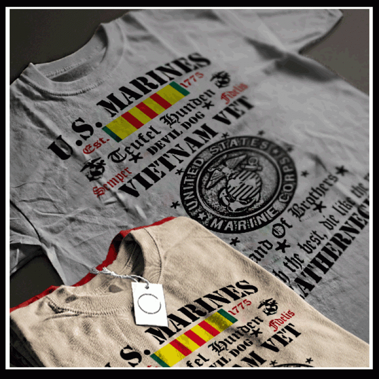 United States Marines Vietnam War Service Ribbon design with USMC Est 1775 and Semper Fidelis Band Of Brothers printed on a soft cotton t-shirt. Great Quality, Clear Image.